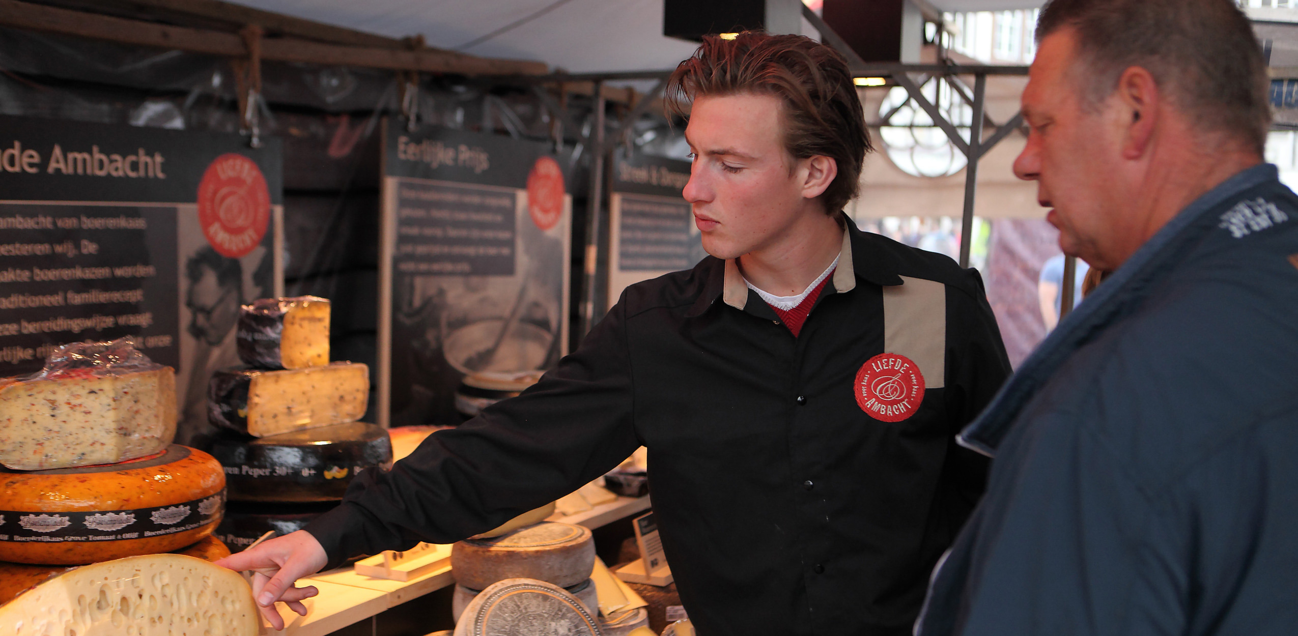 Kaasverkopen op de markt, het is mij als jongste zoon van een Holland Kaascentrum kaasboer, als het ware met de paplepel ingegeven. Zaterdags en in de vakantie meehelpen op de markt, er was altijd werk. Toch vind ik het heel bijzonder dat ik samen met mijn goede vriend Dirk een eigen kaasspeciaalzaak ‘Liefde & Ambacht’ mag runnen op de zaterdagmarkt in mijn geliefde woonplaats ’s-Hertogenbosch. Mensen op een vriendelijke manier helpen, samen met hen een heel lekker of speciaal kaasje uitzoeken, het is echt mijn ding. Of ik ooit fulltime in de kaas ga werken weet ik nog niet. Eerst mijn HBO afmaken dan zie ik wel weer.